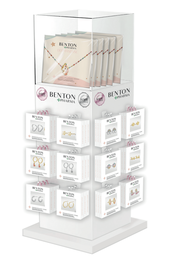 En Benton Pharma, nos especializamos en la fabricación de pendientes esterilizados y dermatológicamente testados, diseñados para la primera y segunda puesta. Nuestro compromiso es ofrecer productos seguros, hipoalergénicos y de la más alta calidad, garantizando una experiencia confiable para los profesionales de la salud y sus pacientes. Con una firme vocación por la innovación y el bienestar, nuestros pendientes están desarrollados bajo estrictos controles sanitarios y se comercializan exclusivamente a través del canal farmacia, asegurando así un entorno profesional y seguro para su aplicación. En Benton Pharma, combinamos ciencia y estética para cuidar cada detalle, brindando soluciones de perforación auricular con la máxima higiene, comodidad y confianza.