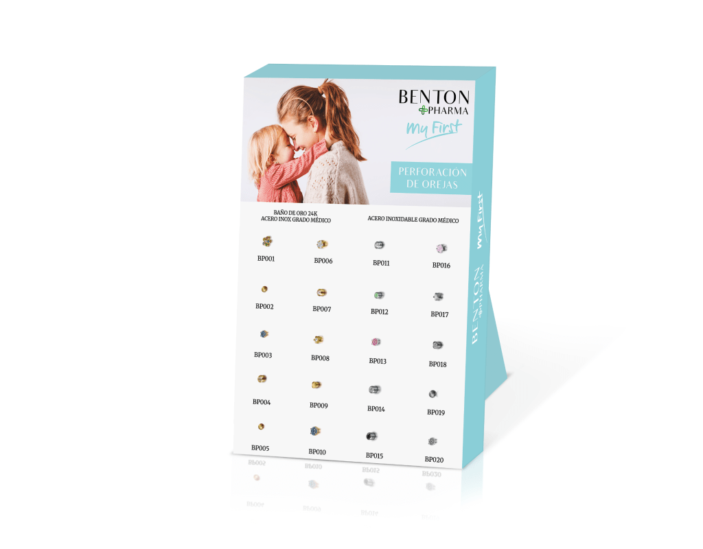 Expositor surtido con 16 modelos hipoalergénicos y dermatológicamente testados , realizados en acero inoxidable grado médico y baño de oro de 18K.
