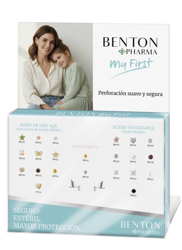 El extremo del pendiente Benton Pharma es extremadante fino y está realizado en acero quirúrgico para dotarlo de la máxima seguridad en el momento de la puesta.