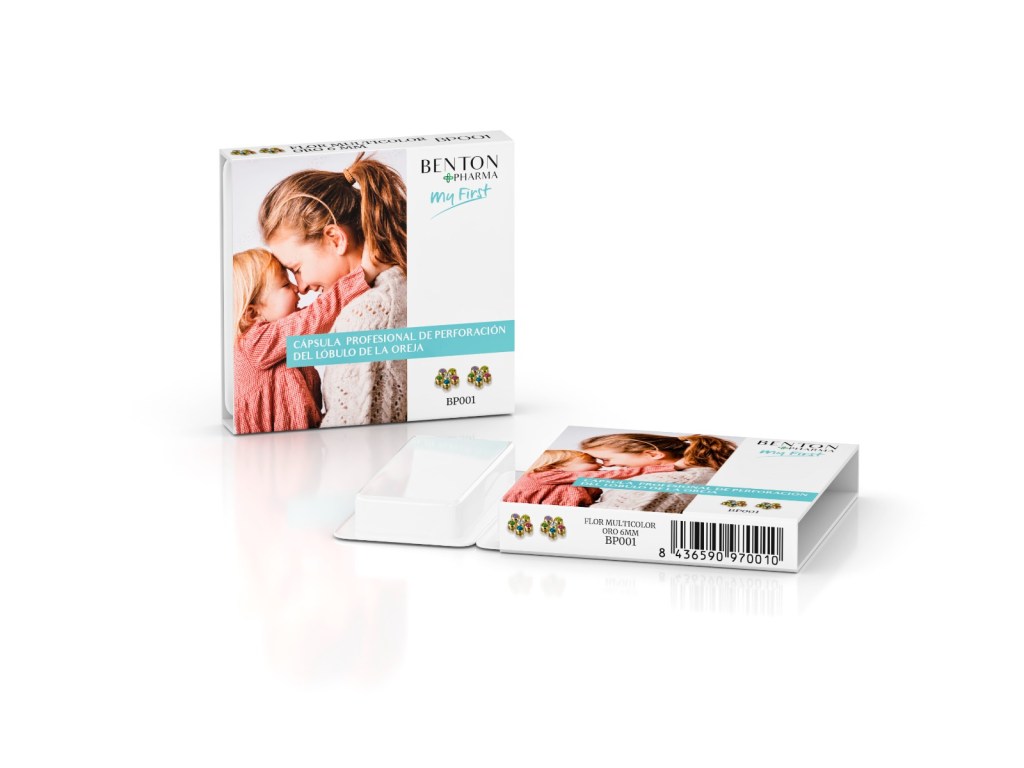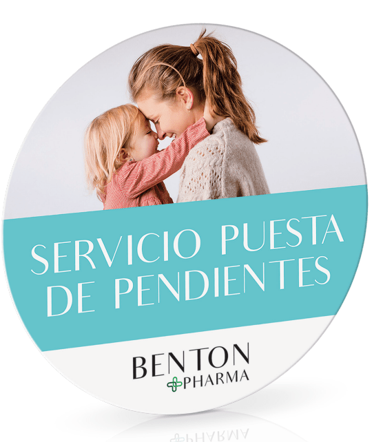 El extremo del pendiente Benton Pharma es extremadante fino y está realizado en acero quirúrgico para dotarlo de la máxima seguridad en el momento de la puesta.